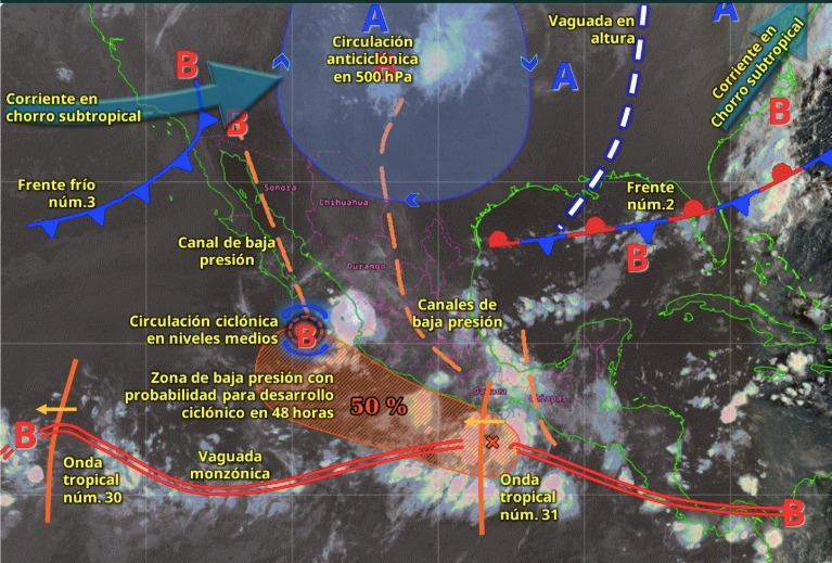Al mismo tiempo, el posible ciclón “Mario”, ubicado frente a las costas del Pacífico, amenaza con provocar lluvias puntuales muy fuertes en Nayarit, Sinaloa, Durango y estados colindantes, elevando el riesgo de tormentas y granizo.